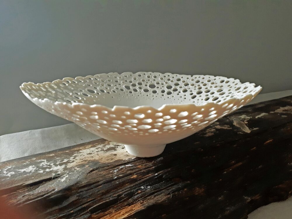 Jill will take you through the stages of rolling out the porcelain and constructing the candle holder. After drying it out a little the pot is then ready to be decorated with a pierced design of your own. Stars and hearts look especially lovely – you could even pierce initials of a loved one or choose your own personal design.